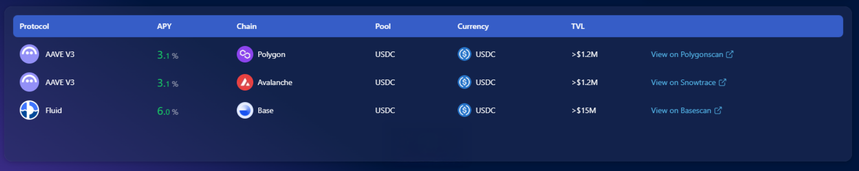 Each strategy displays protocol information, APY (for informational purposes only), supported currencies, and chain data to help you evaluate options. From stablecoin staking to higher-yield liquidity pools, AstraBlox offers visibility to align with your portfolio and risk preferences. Learn more about yield strategies on our blog.